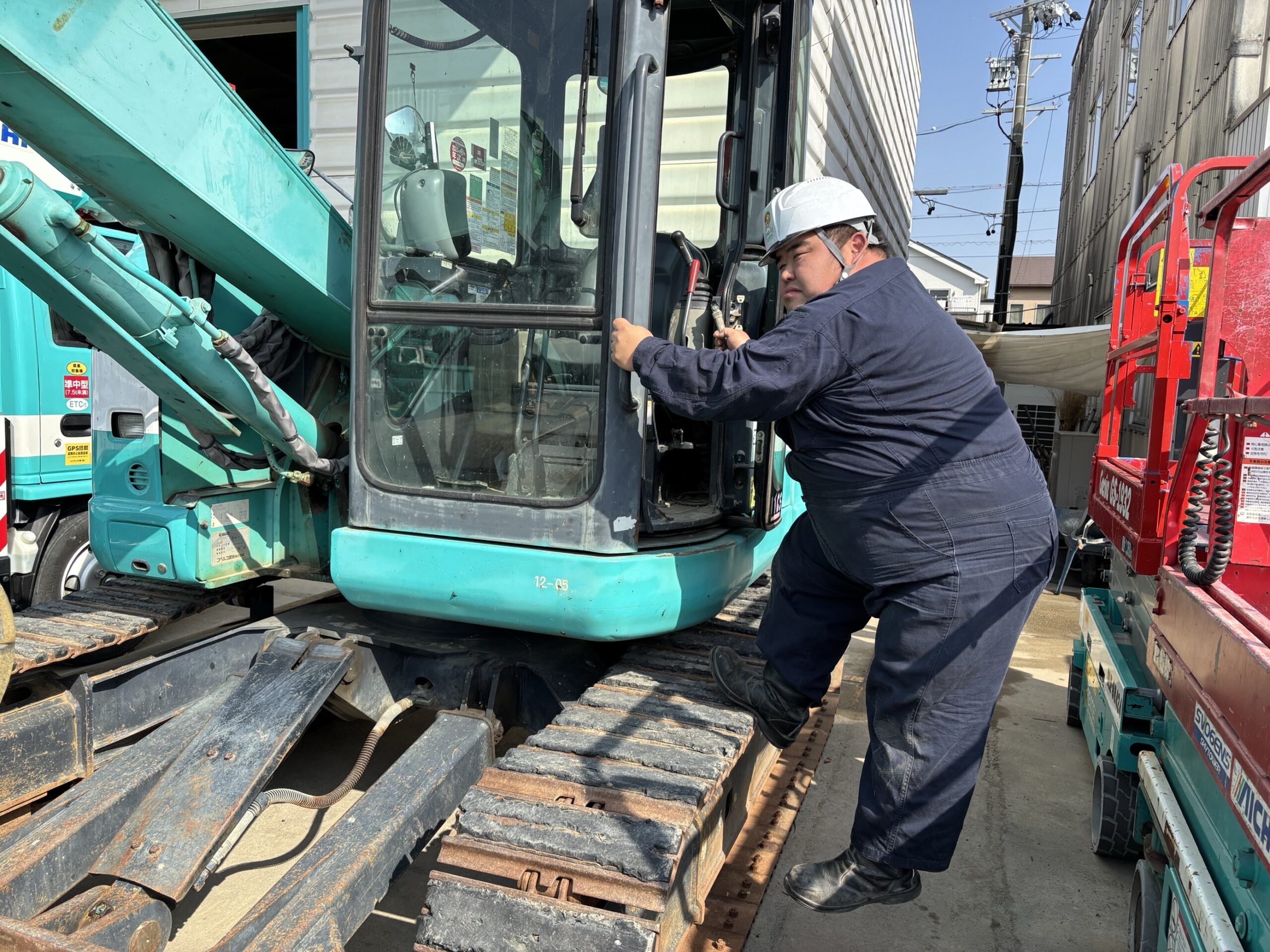 「重機に乗り込む際は三点支持を徹底します。」